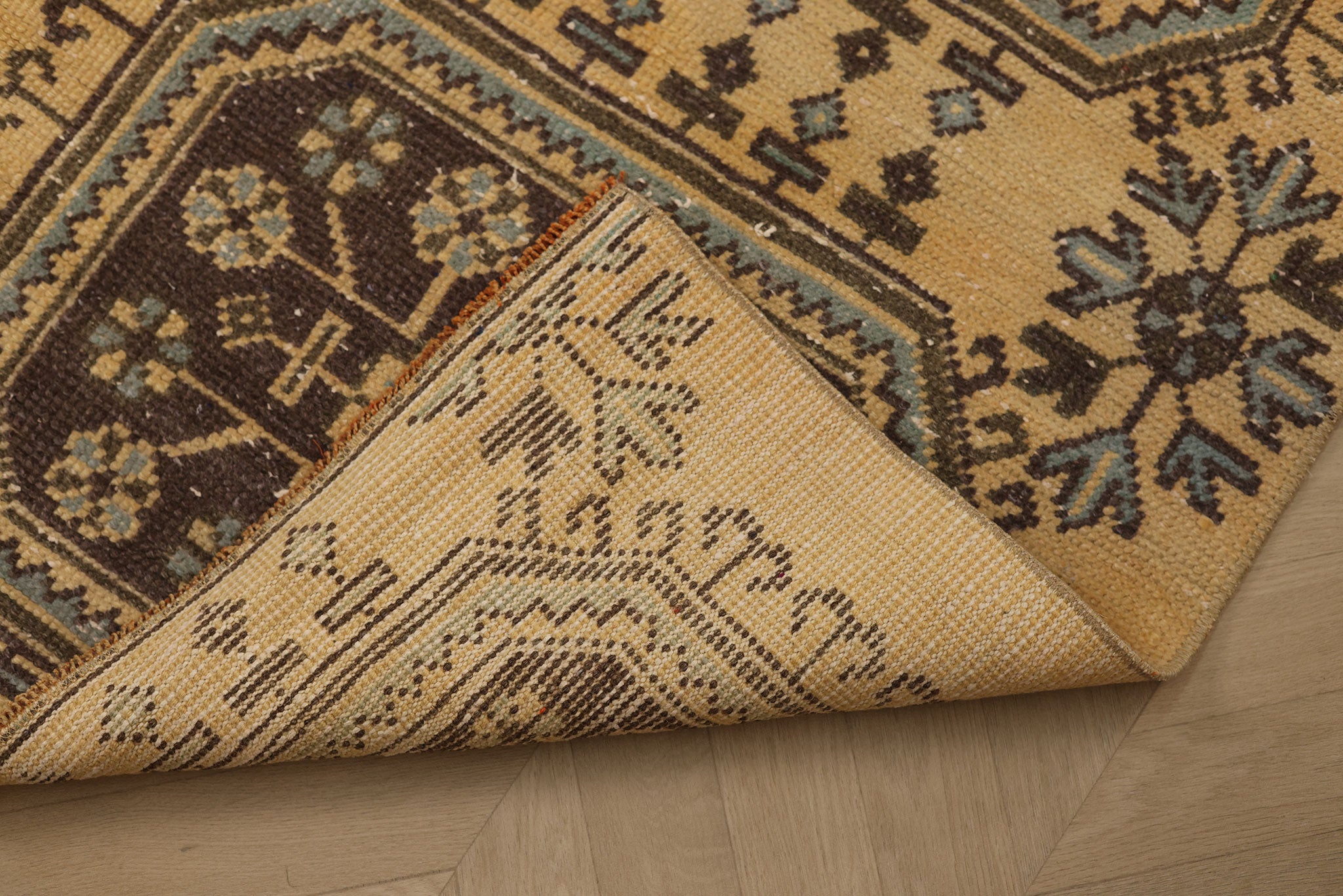 Every 3–5 years, we suggest a professional hand-wash for vintage Turkish rugs. Please avoid steam cleaning or dry cleaning, as these methods can damage natural wool fibers and vegetable dyes. A safe cleaning method involves pH-balanced soap and a soft-bristled brush, followed by gentle rinsing.