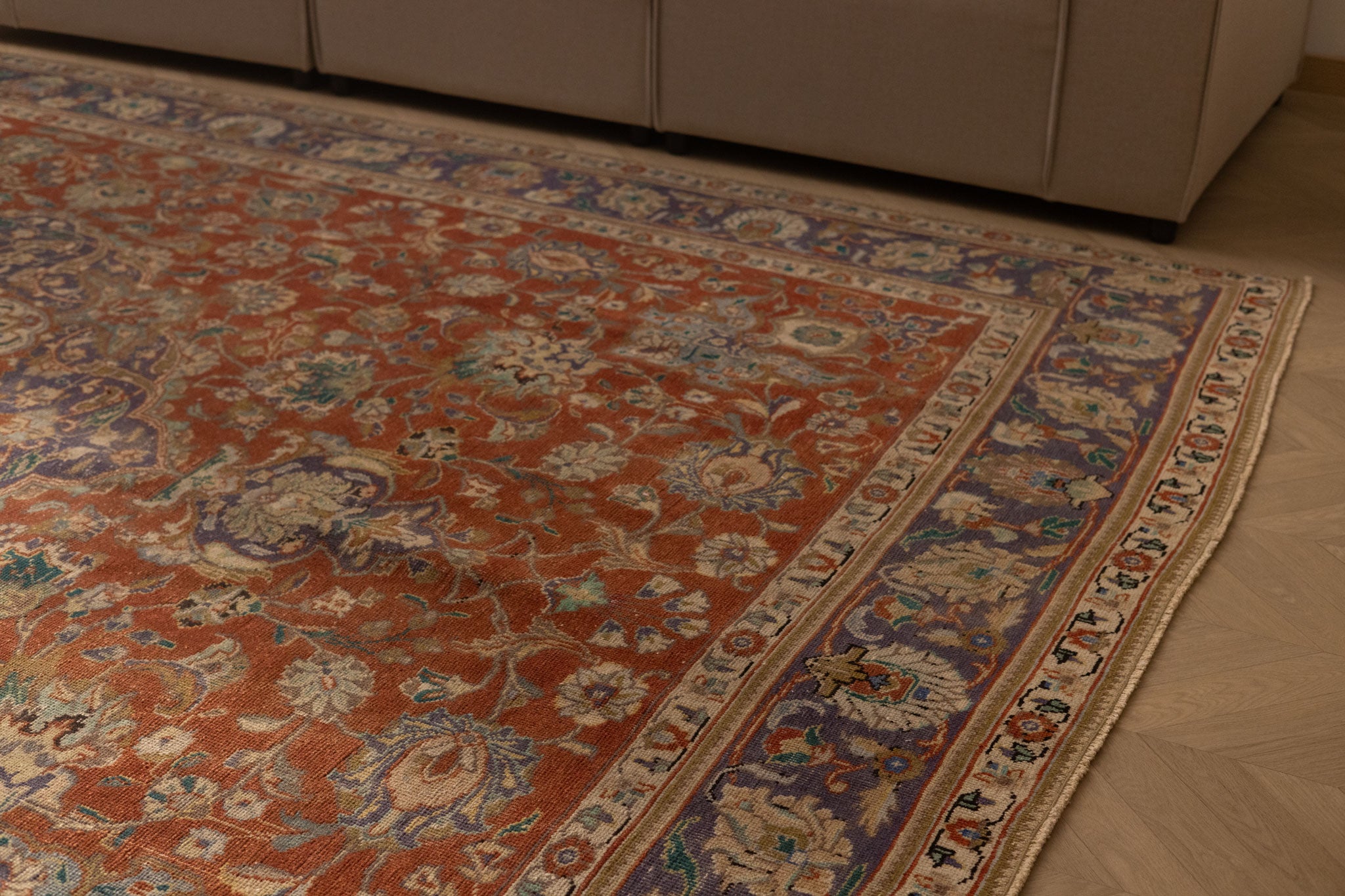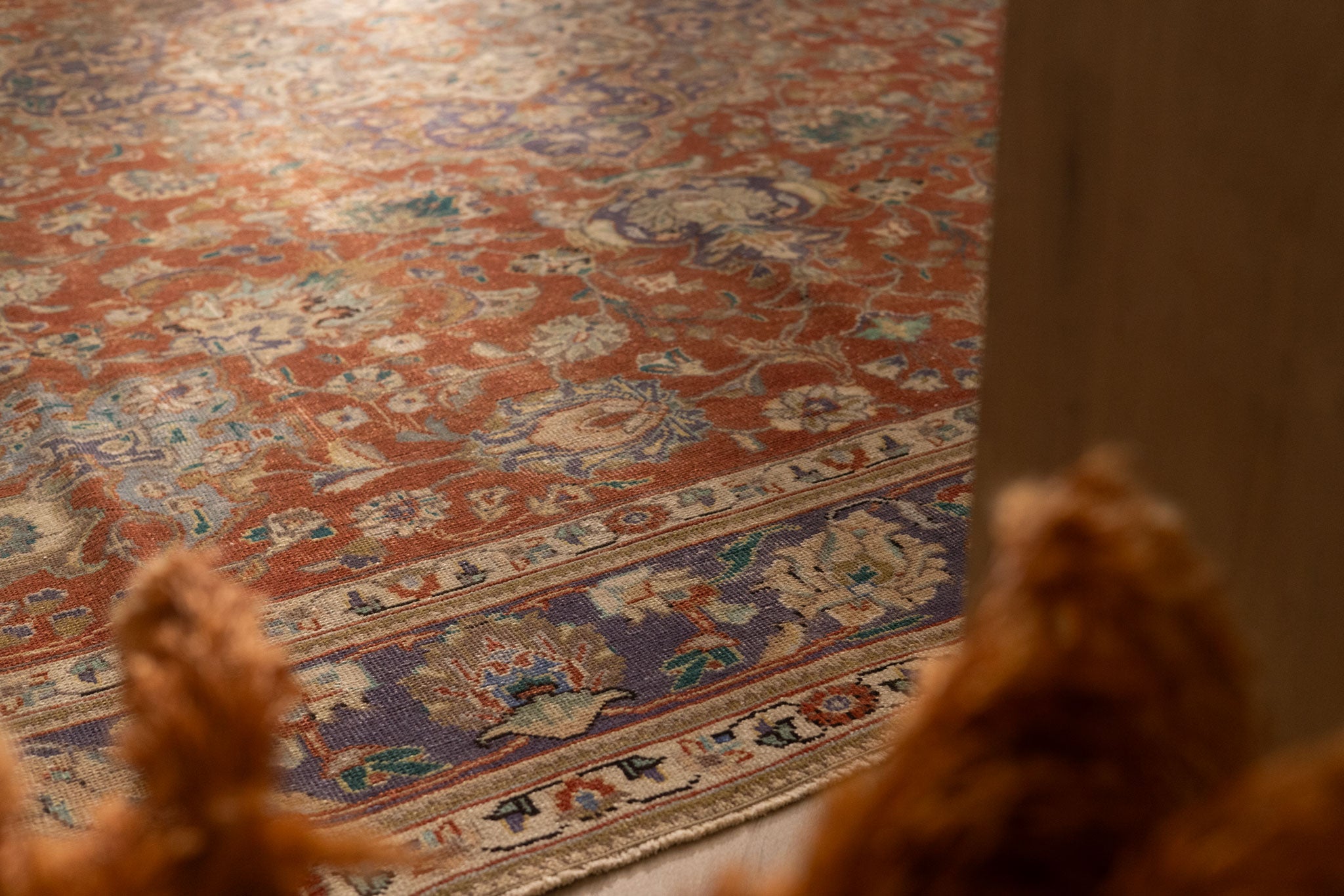 We recommend vacuuming your vintage rug once or twice a month to remove dust and dirt. Use a suction-only vacuum or an attachment without a rotary brush, as this protects the wool fibers and hand-knotted foundation from unnecessary wear.