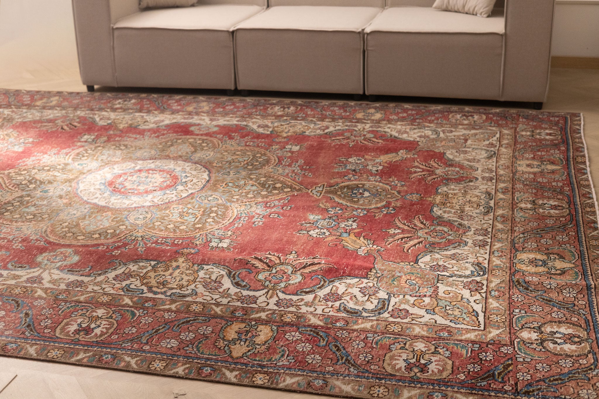 Handwoven Turkish rugs with rich, saturated colors may experience slight color bleeding when spot-cleaned. Always test a small hidden area first and dry thoroughly. To prevent fading of vintage rugs, avoid direct sunlight exposure over long periods.