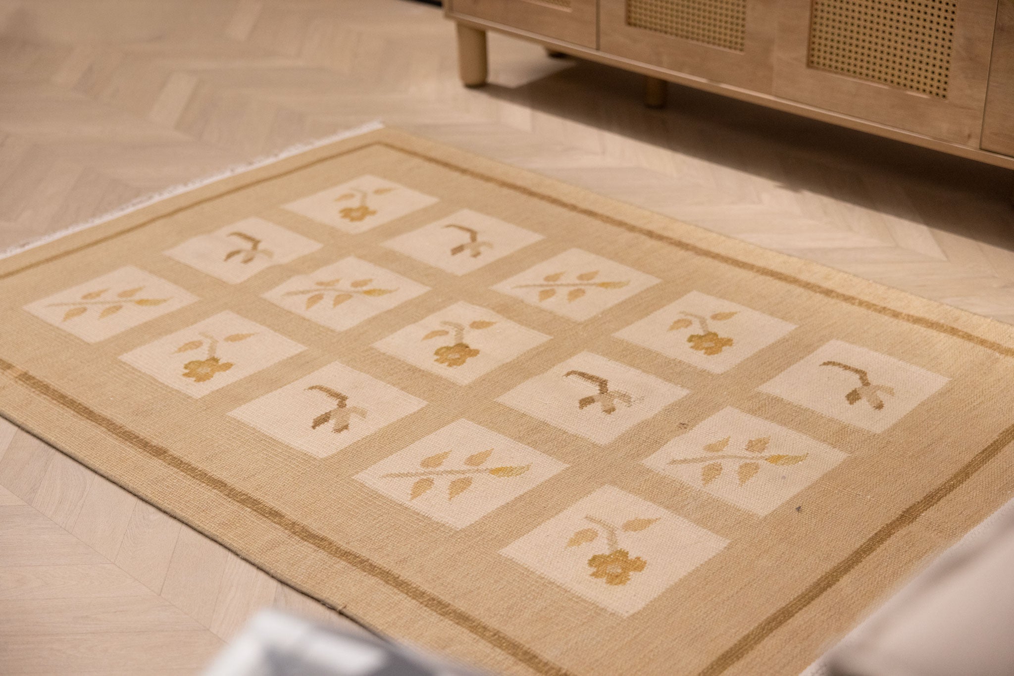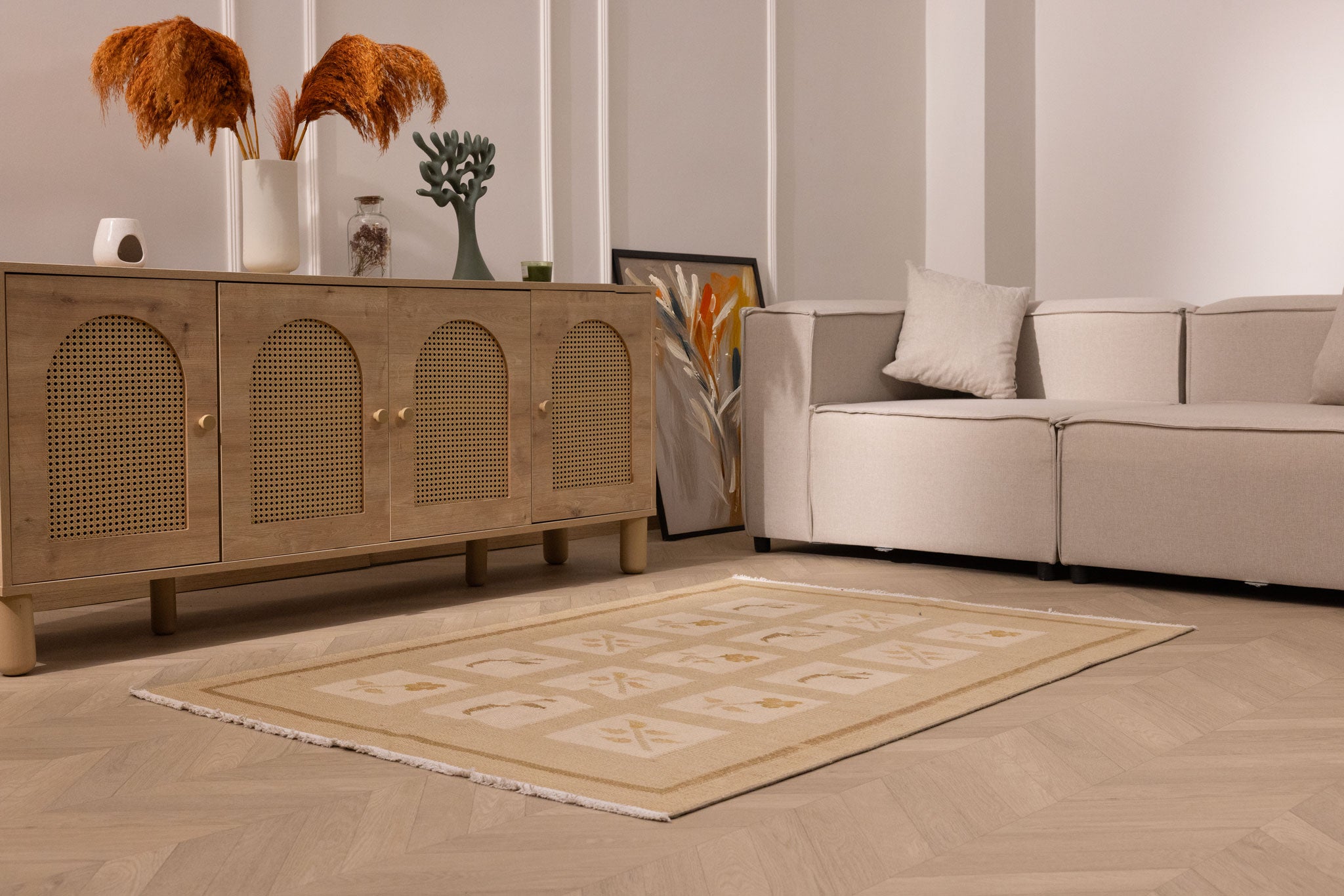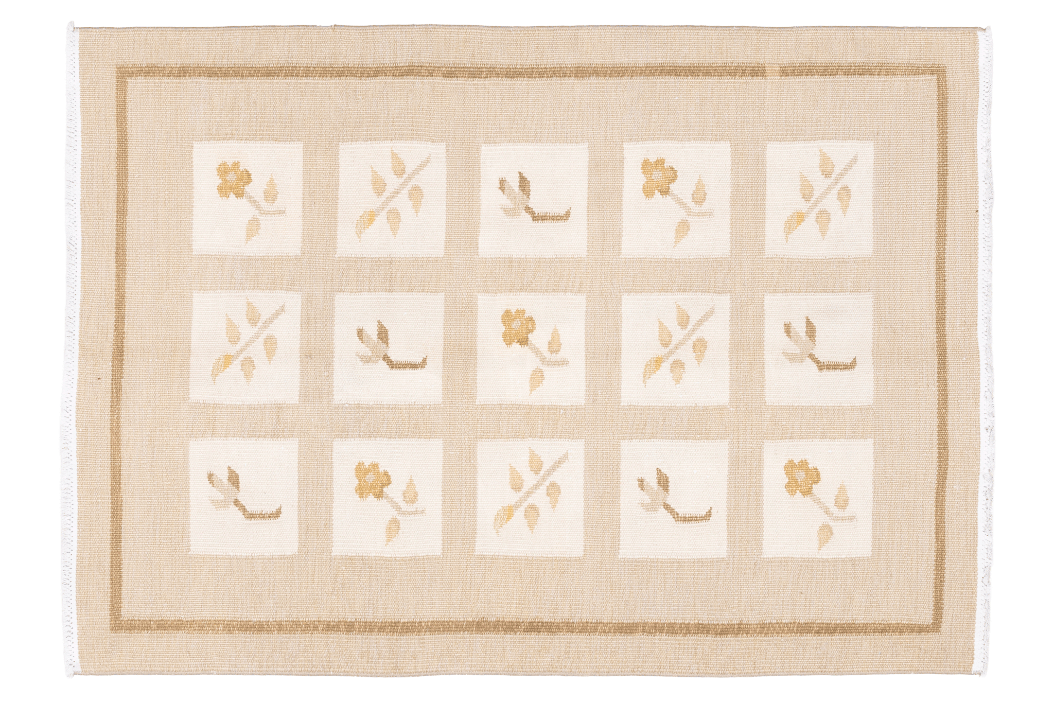 4 x 5.7 ft (122 x 173 cm) Flatweave Pile %50 Wool, %50 Cotton colors: Beige, Brown Floral, Minimalist Patterns, Modern style Discover Turkish area rugs that blend traditional craftsmanship with timeless style. Hand-woven with rich colors and intricate details, perfect for elevating any room in your home.