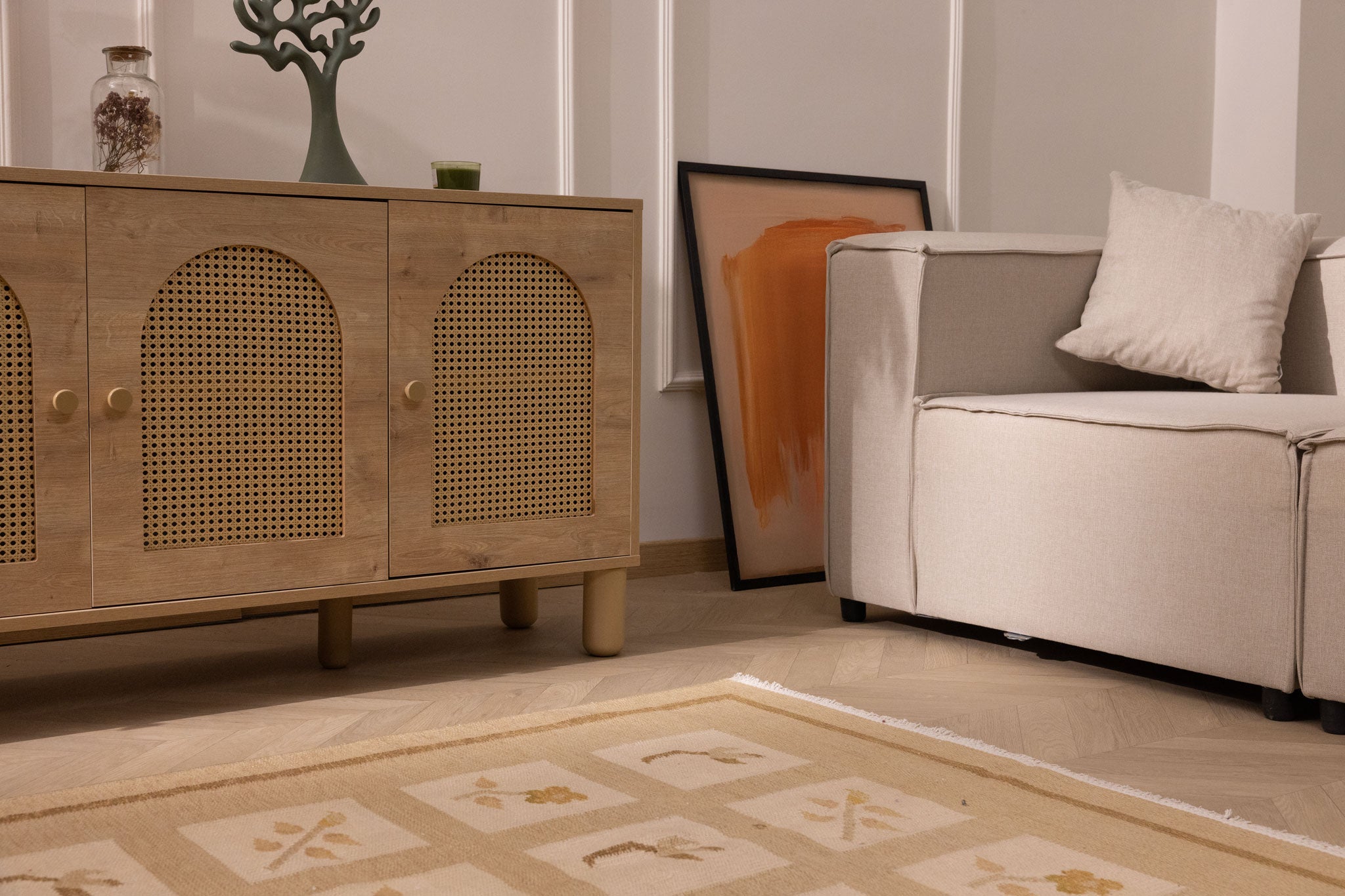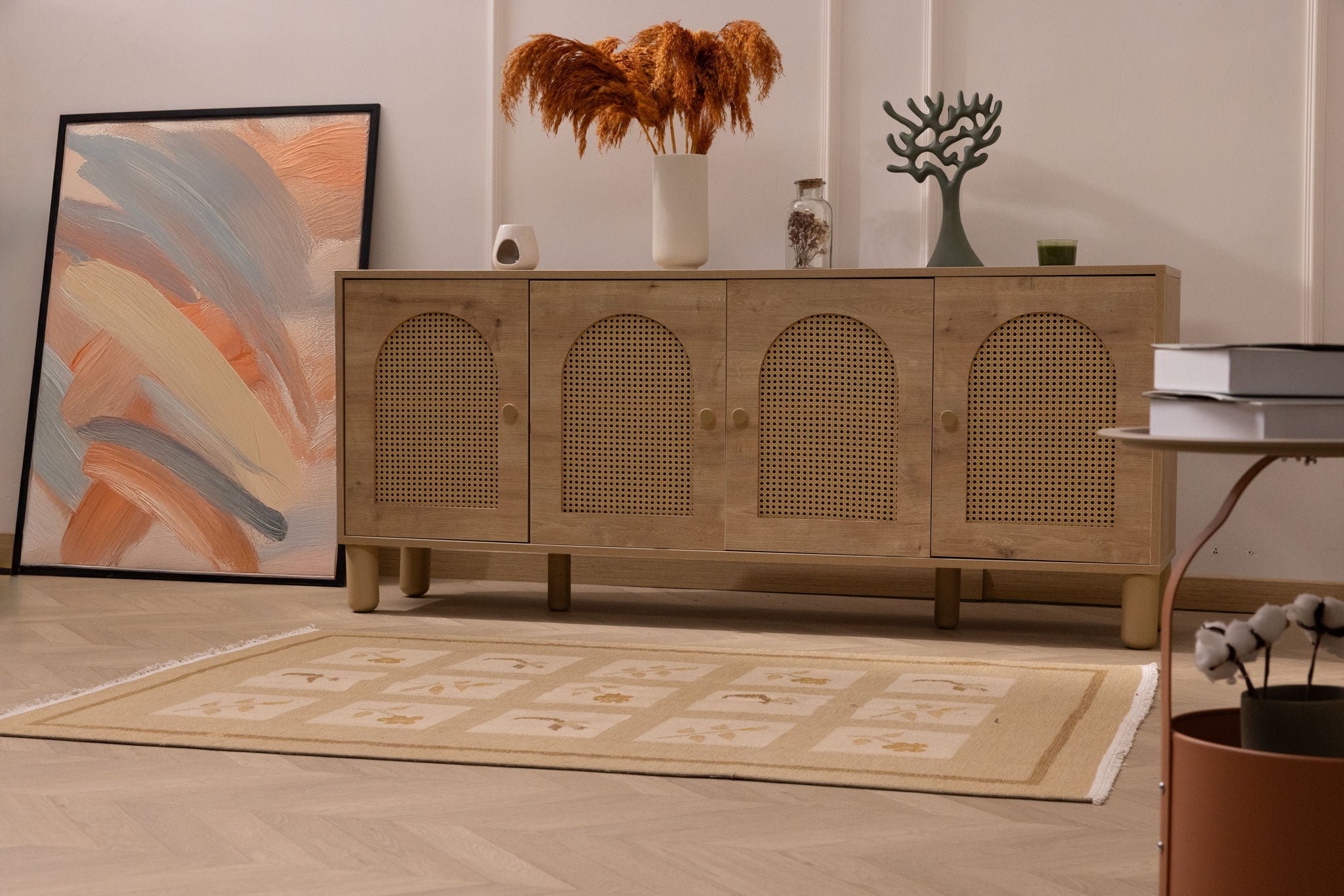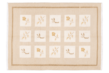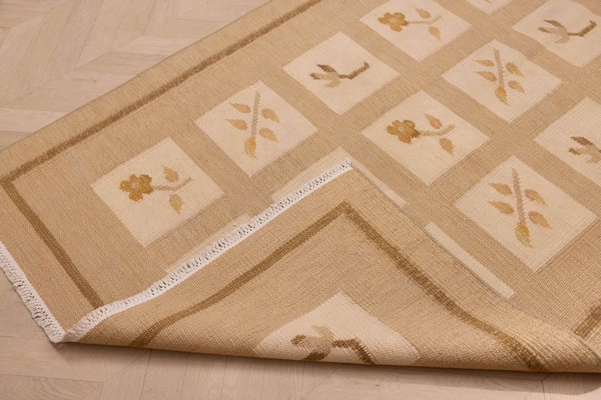 4 x 5.7 ft (122 x 173 cm) Flatweave Pile %50 Wool, %50 Cotton colors: Beige, Brown Floral, Minimalist Patterns, Modern style Discover Turkish area rugs that blend traditional craftsmanship with timeless style. Hand-woven with rich colors and intricate details, perfect for elevating any room in your home.