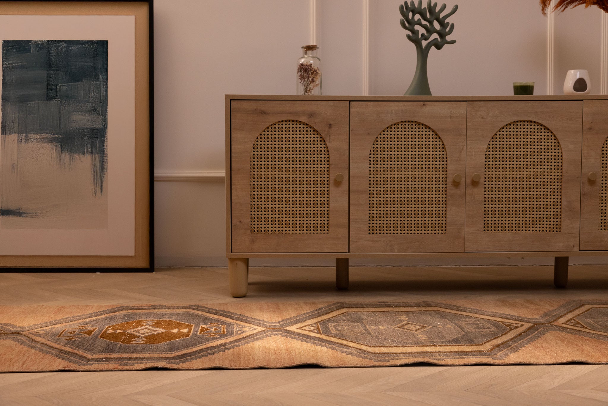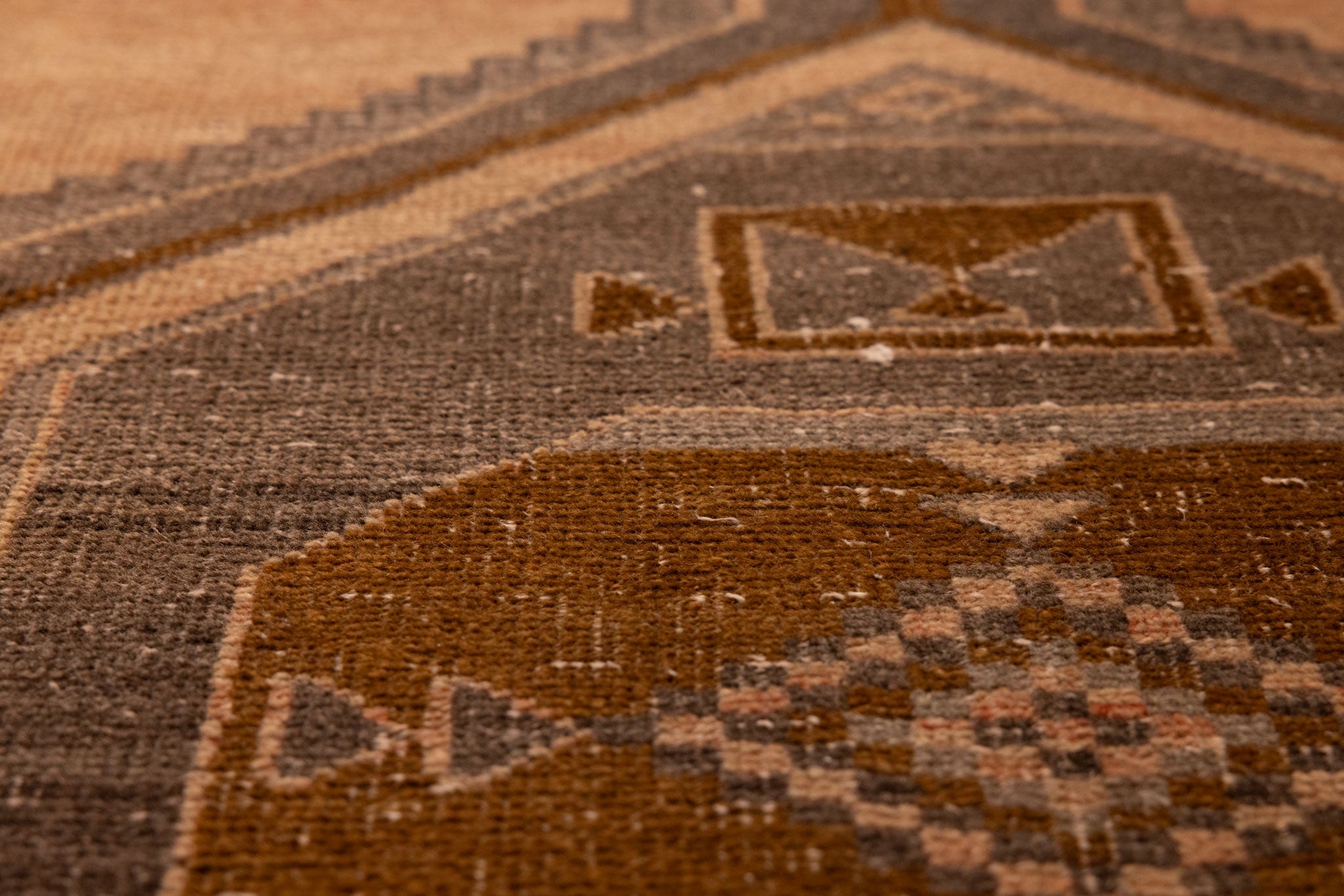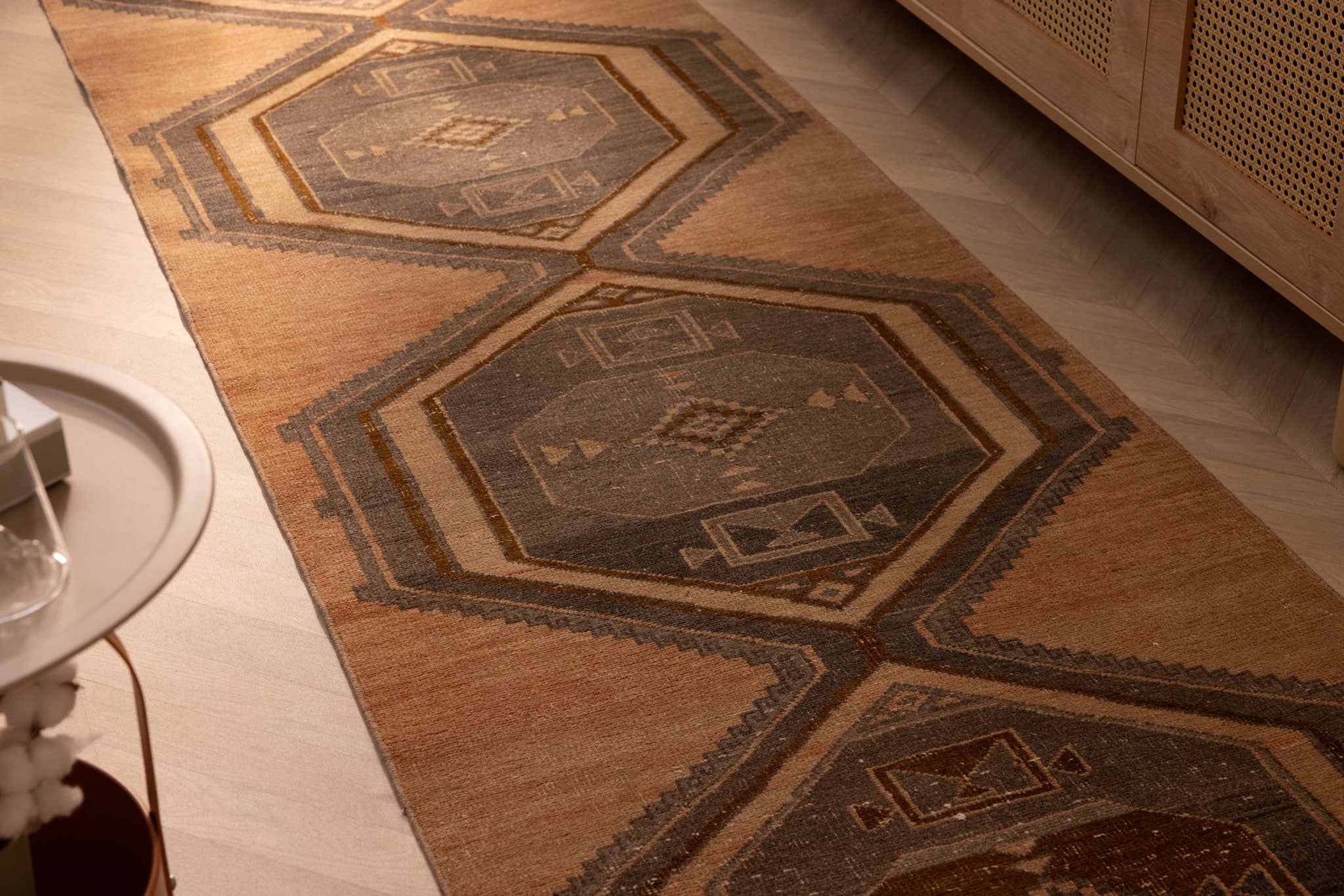 We recommend vacuuming your vintage rug once or twice a month to remove dust and dirt. Use a suction-only vacuum or an attachment without a rotary brush, as this protects the wool fibers and hand-knotted foundation from unnecessary wear.