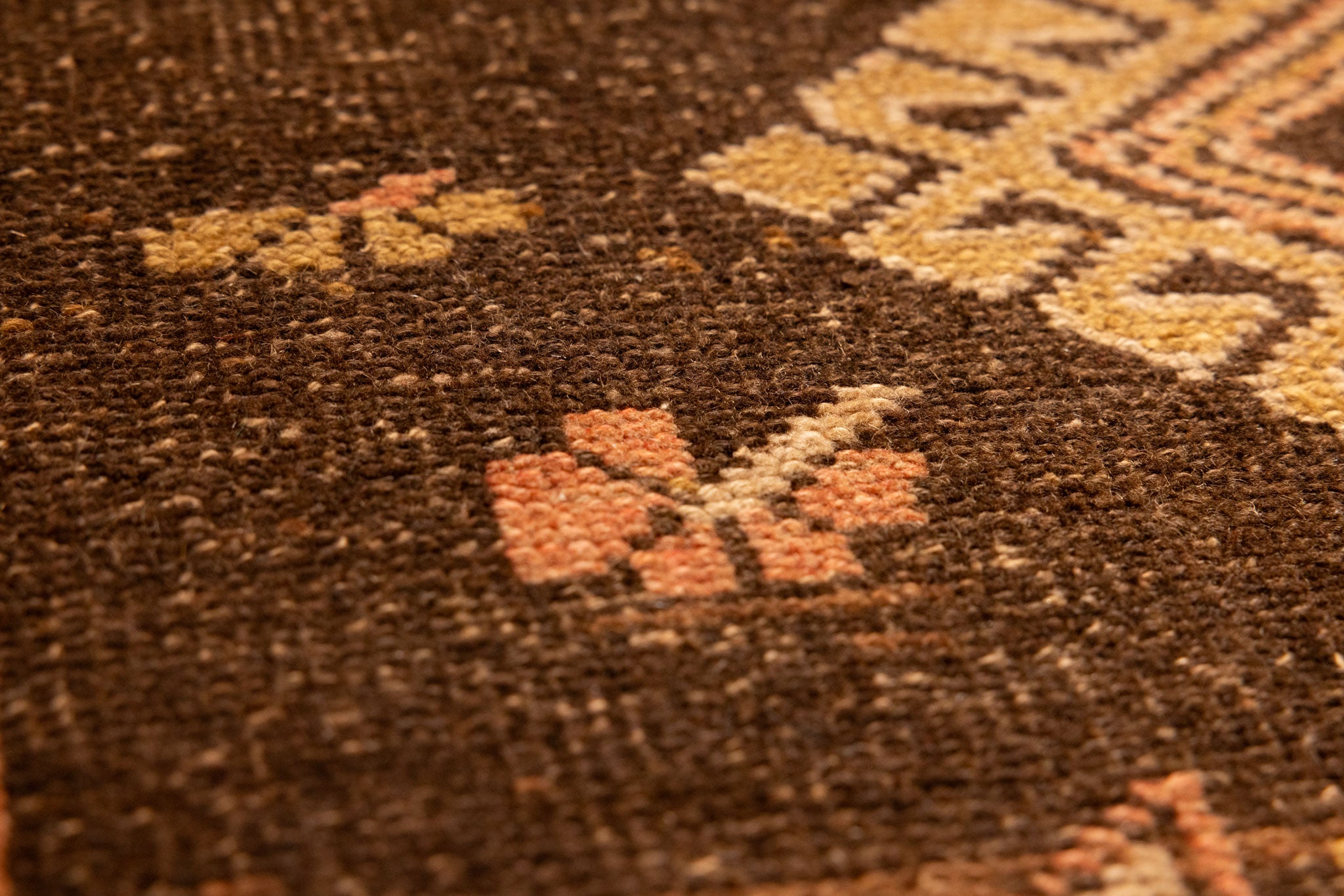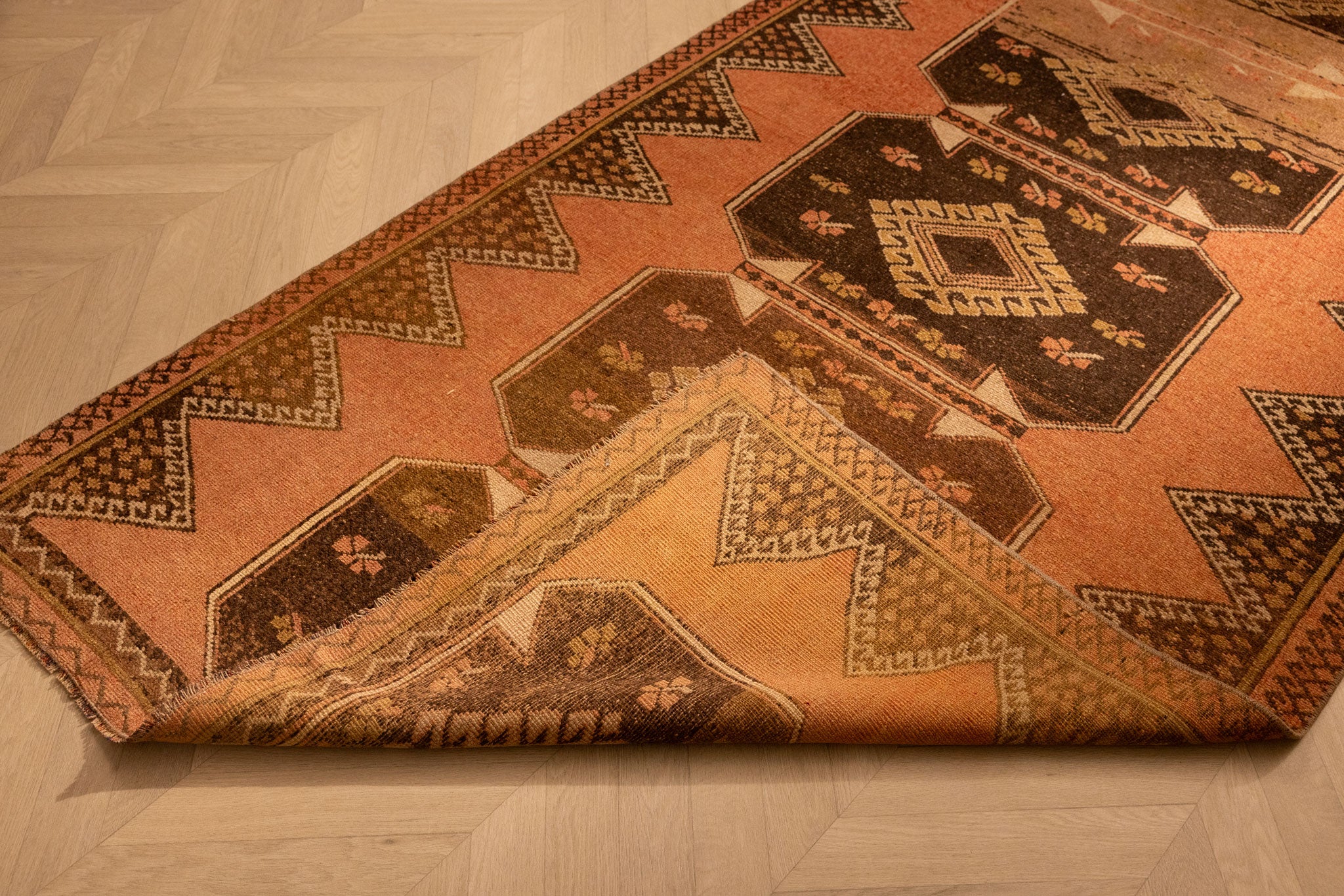 Every 3–5 years, we suggest a professional hand-wash for vintage Turkish rugs. Please avoid steam cleaning or dry cleaning, as these methods can damage natural wool fibers and vegetable dyes. A safe cleaning method involves pH-balanced soap and a soft-bristled brush, followed by gentle rinsing.