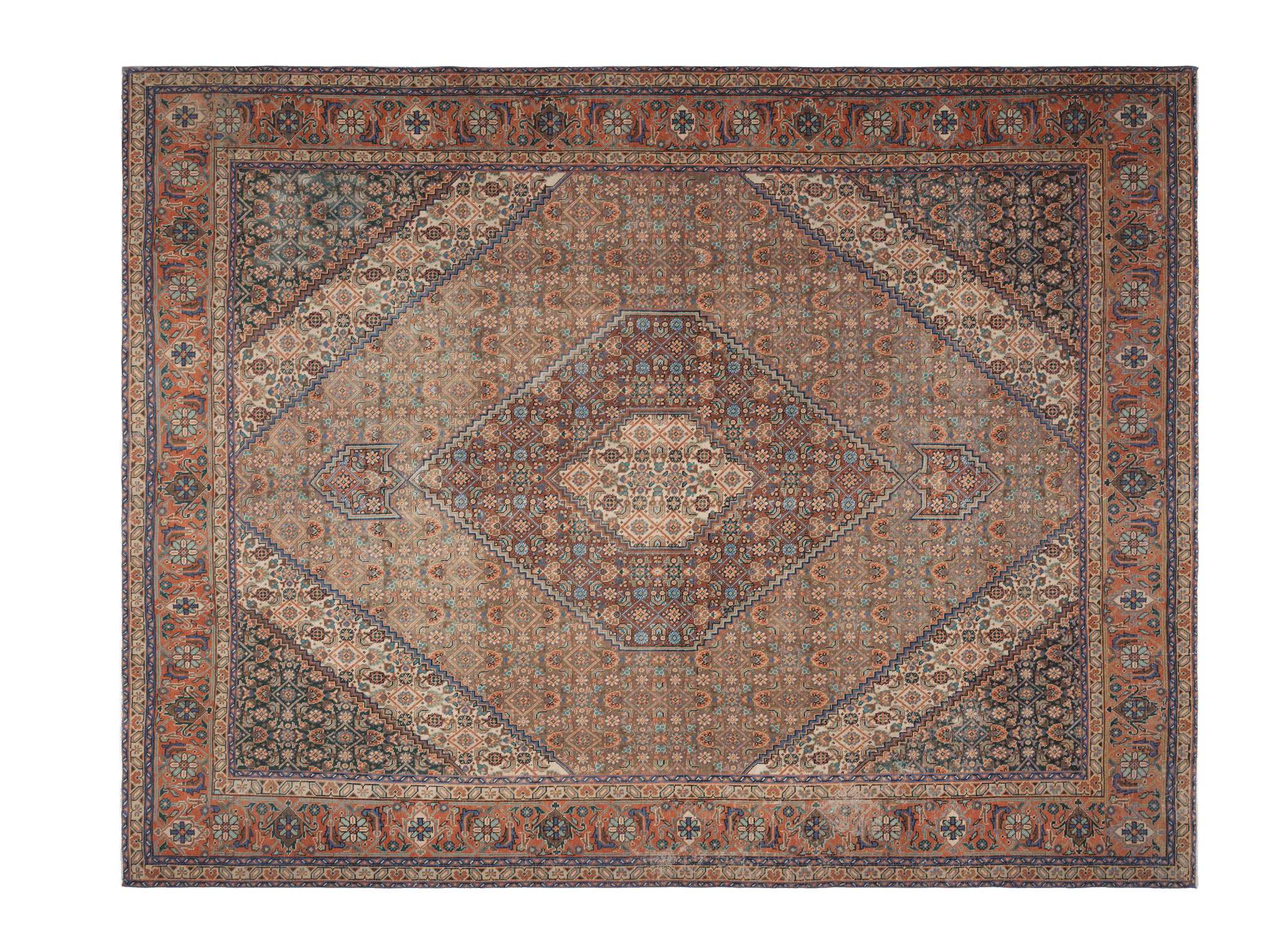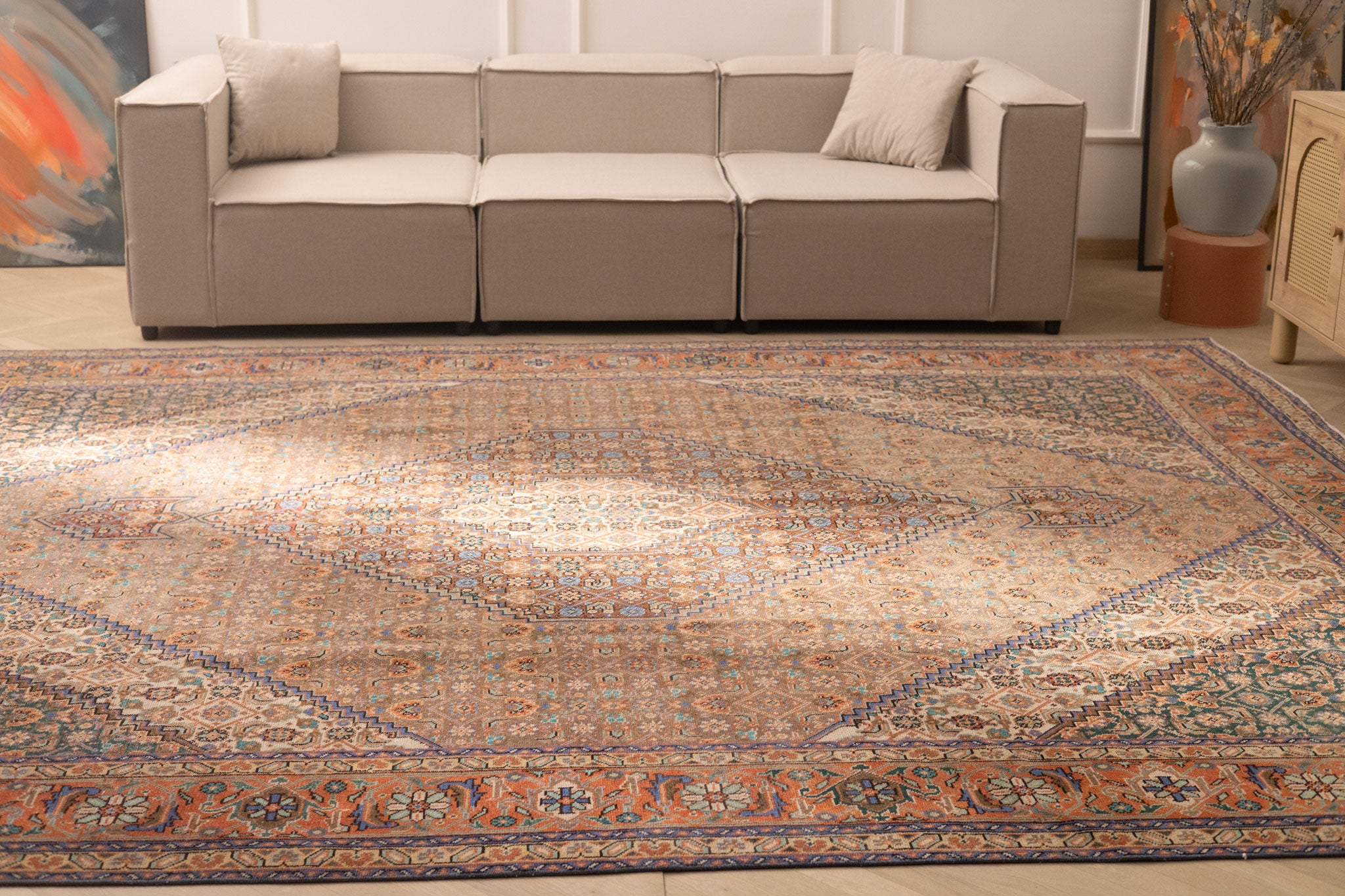 Persian style oversized area rug with elegant floral motifs and rich colors. Luxurious design that anchors your space beautifully. Timeless craftsmanship meets sophisticated style for any room.