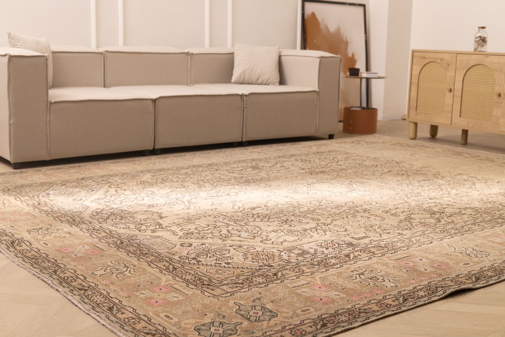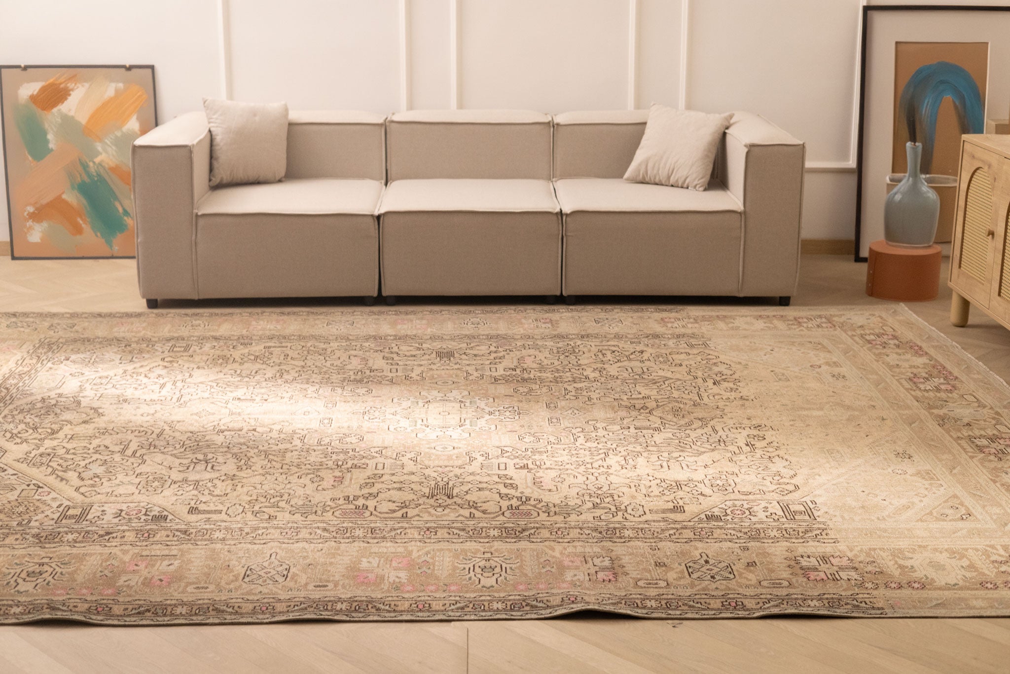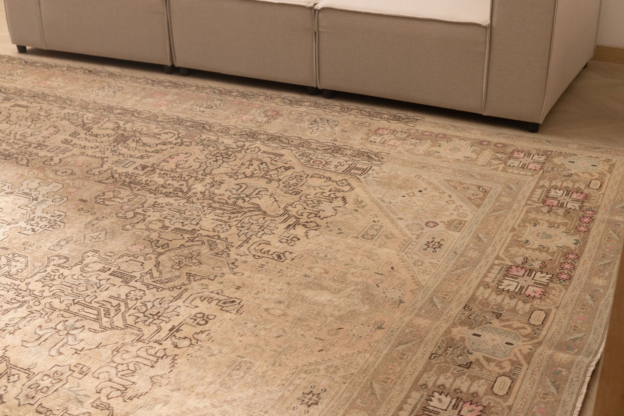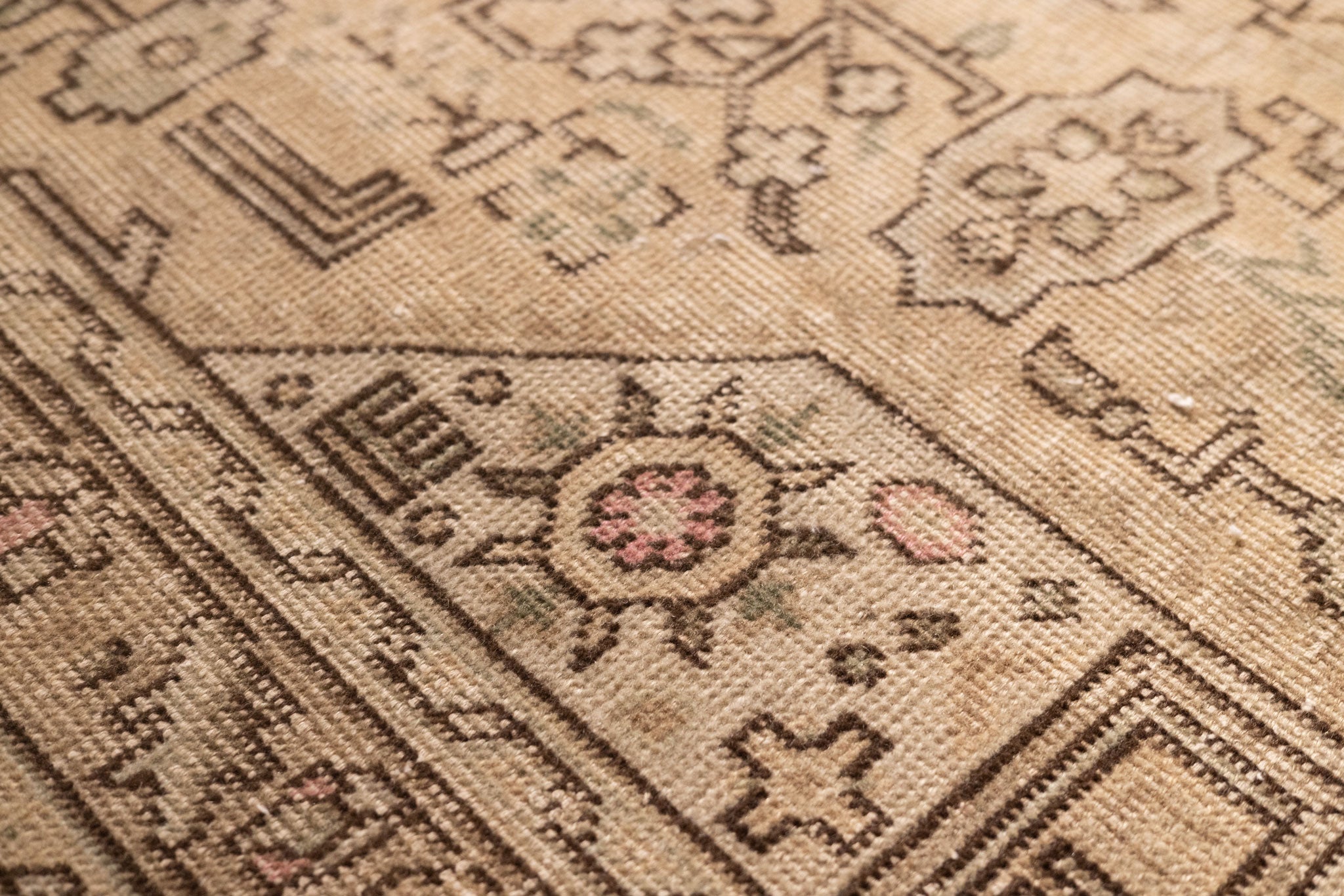 We recommend vacuuming your vintage rug once or twice a month to remove dust and dirt. Use a suction-only vacuum or an attachment without a rotary brush, as this protects the wool fibers and hand-knotted foundation from unnecessary wear.