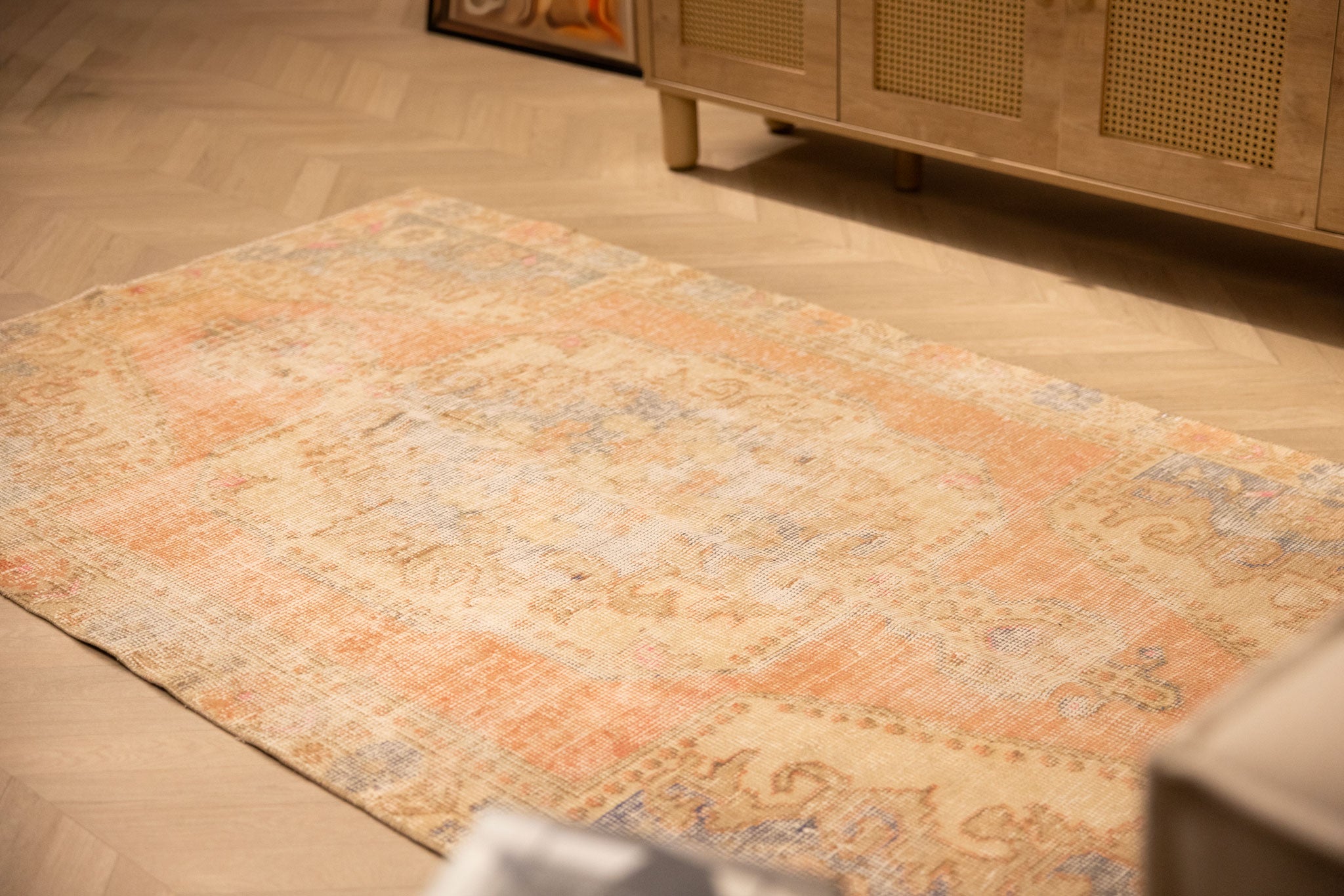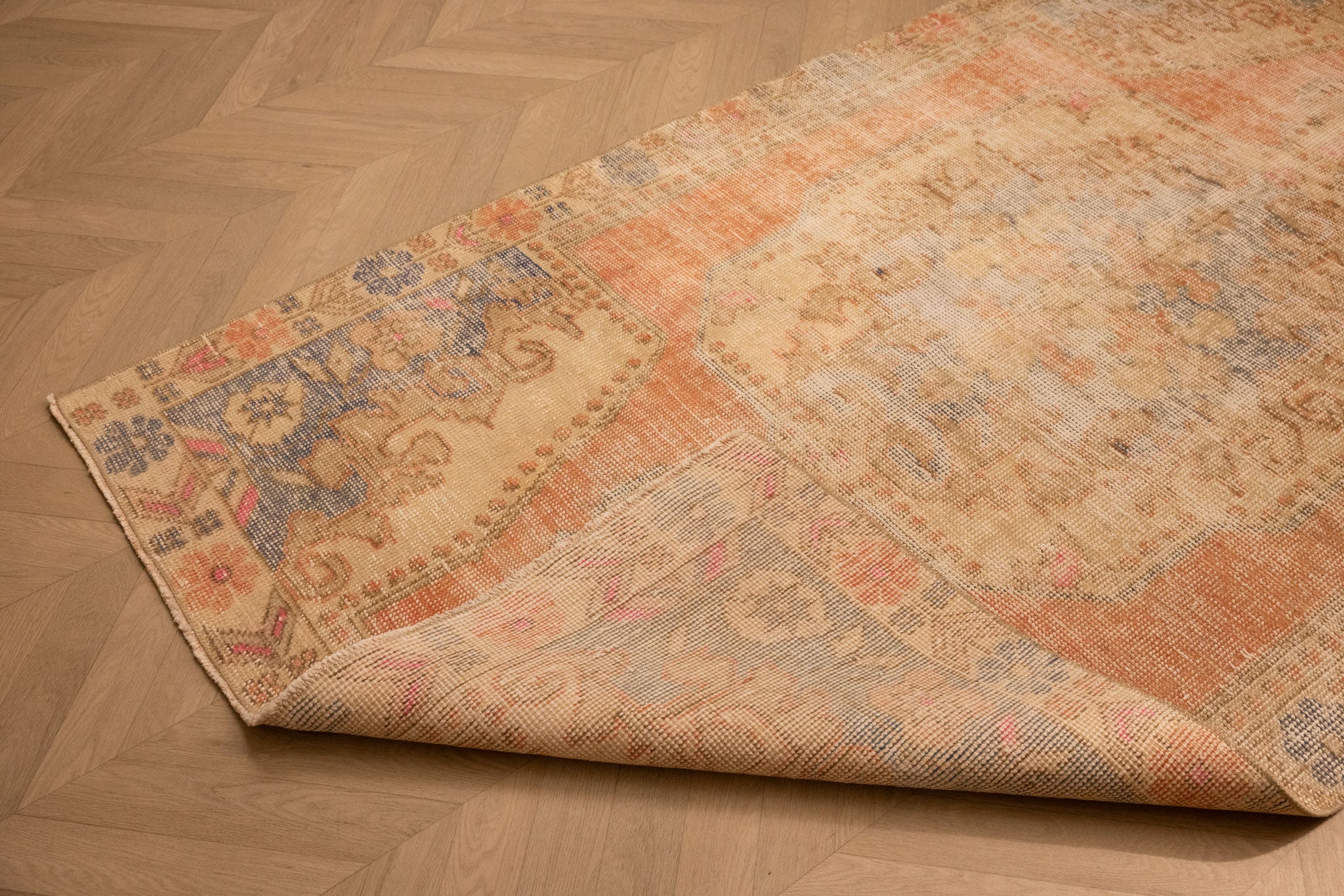 Every 3–5 years, we suggest a professional hand-wash for vintage Turkish rugs. Please avoid steam cleaning or dry cleaning, as these methods can damage natural wool fibers and vegetable dyes. A safe cleaning method involves pH-balanced soap and a soft-bristled brush, followed by gentle rinsing.