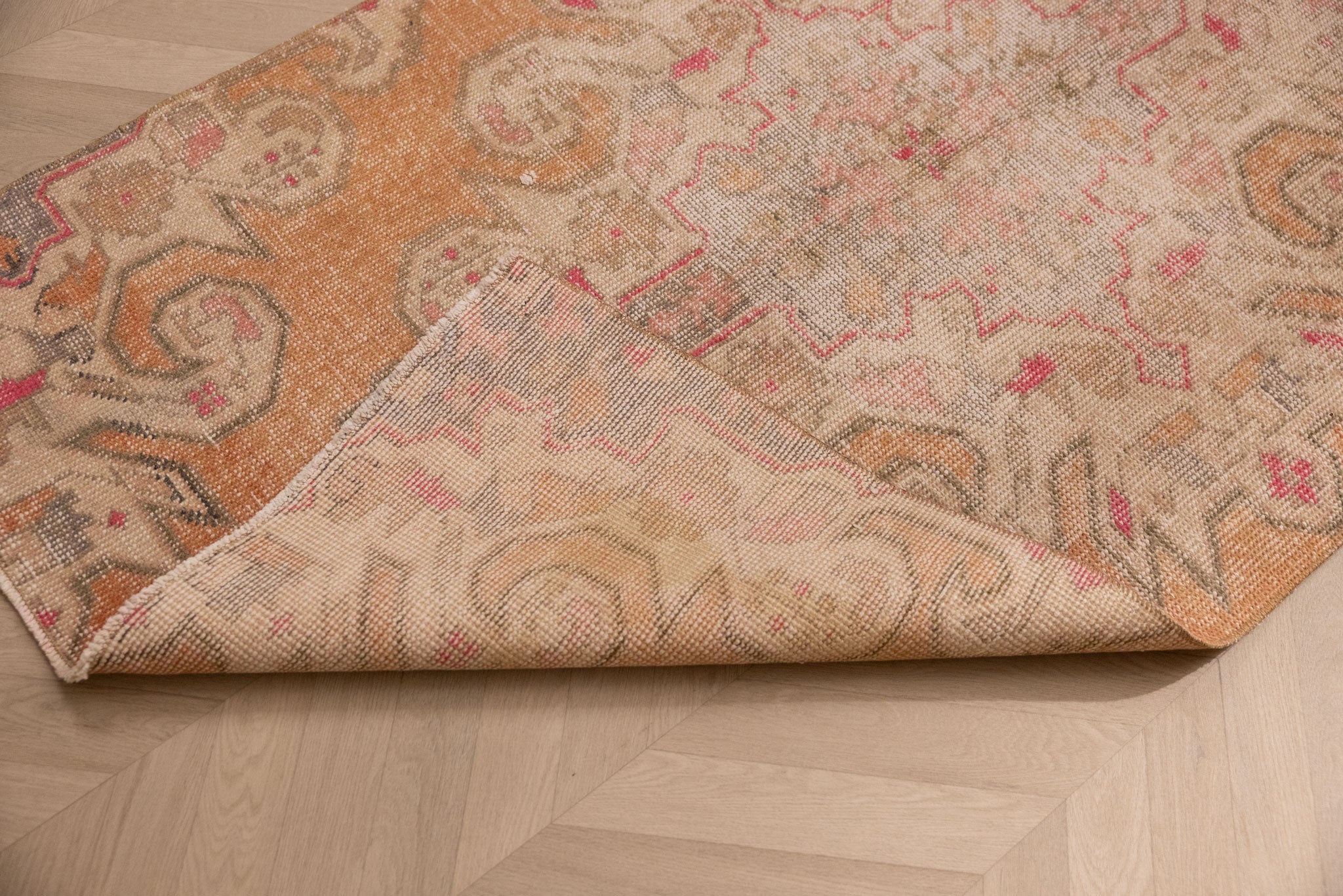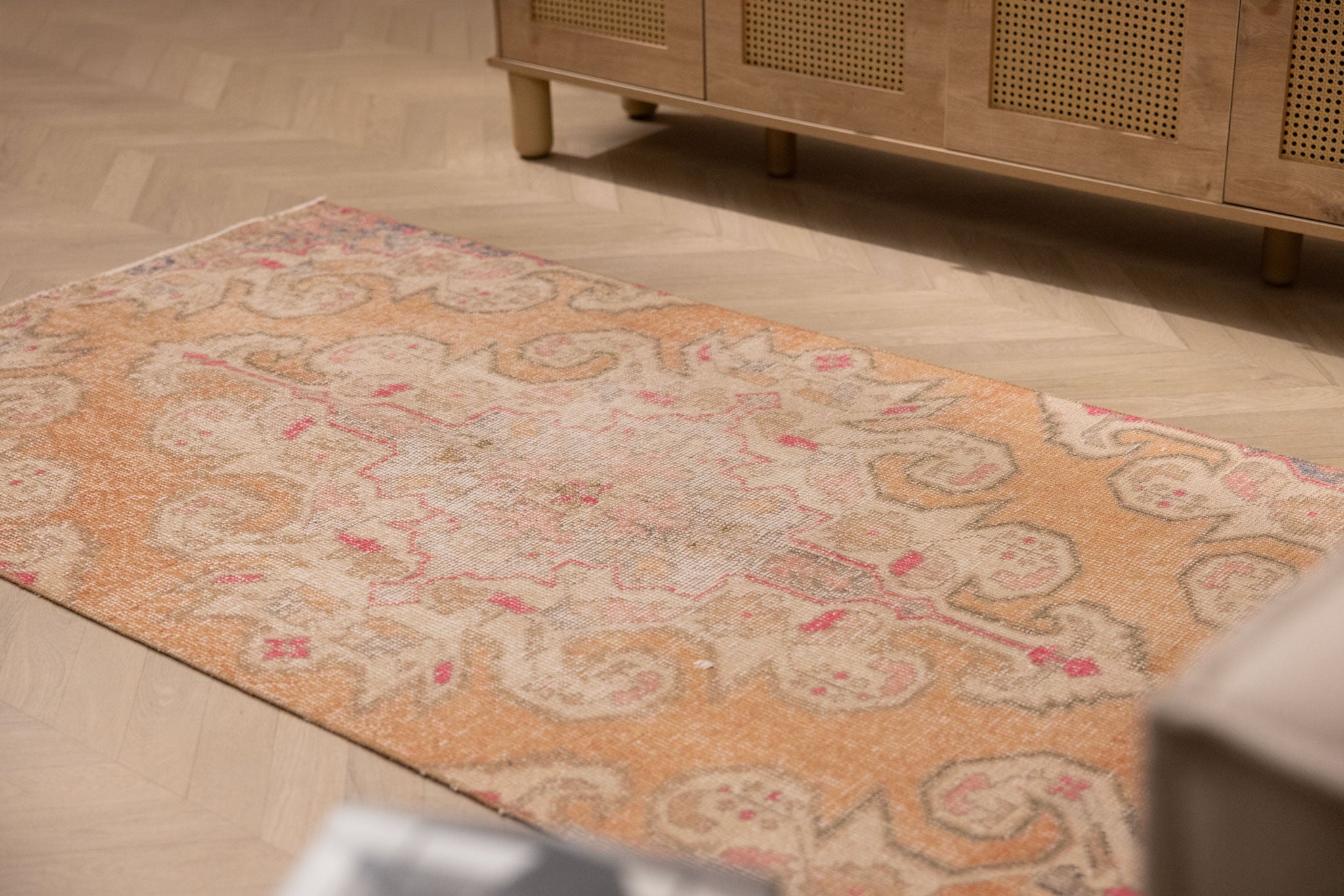 Every 3–5 years, we suggest a professional hand-wash for vintage Turkish rugs. Please avoid steam cleaning or dry cleaning, as these methods can damage natural wool fibers and vegetable dyes. A safe cleaning method involves pH-balanced soap and a soft-bristled brush, followed by gentle rinsing.