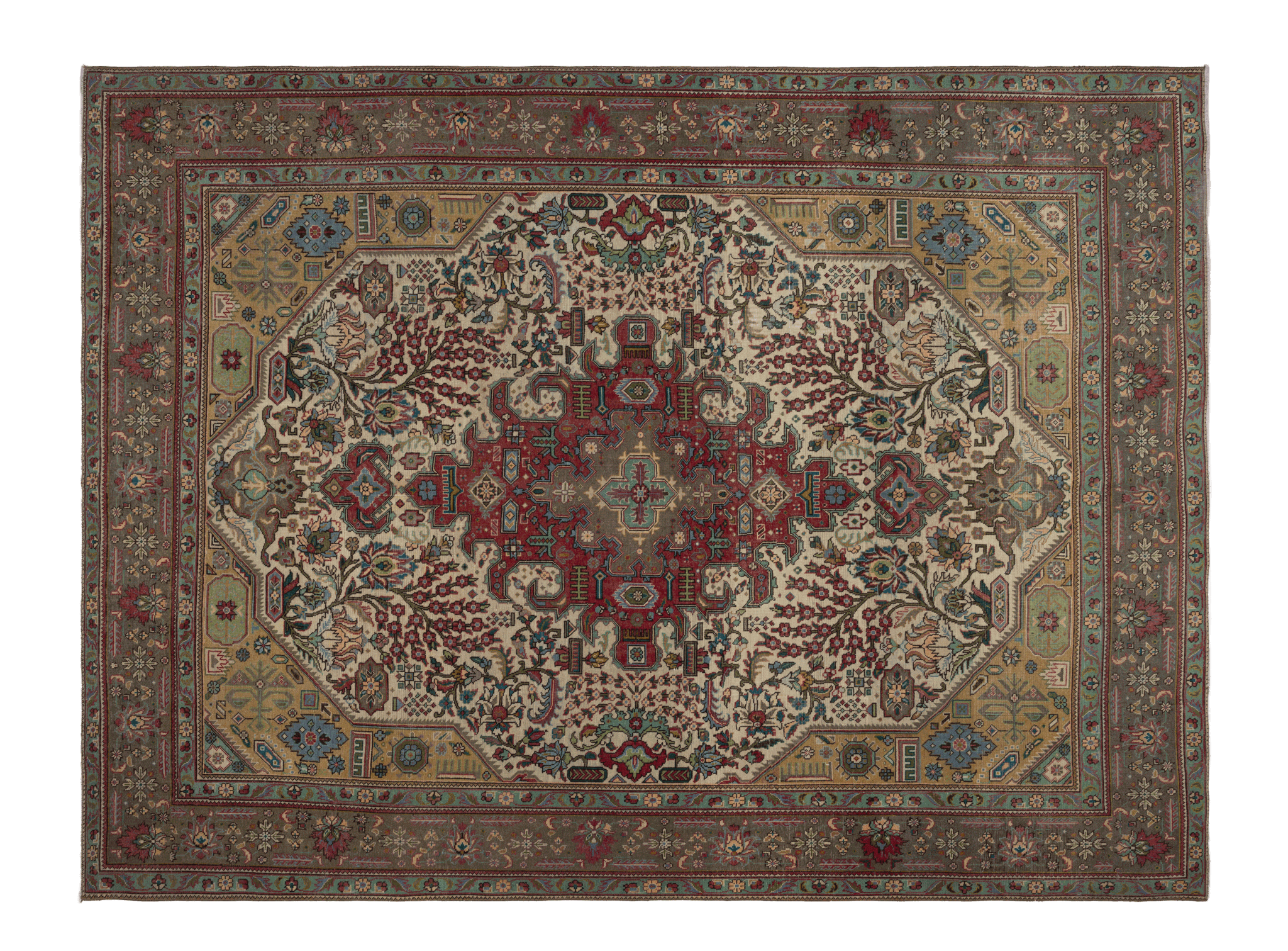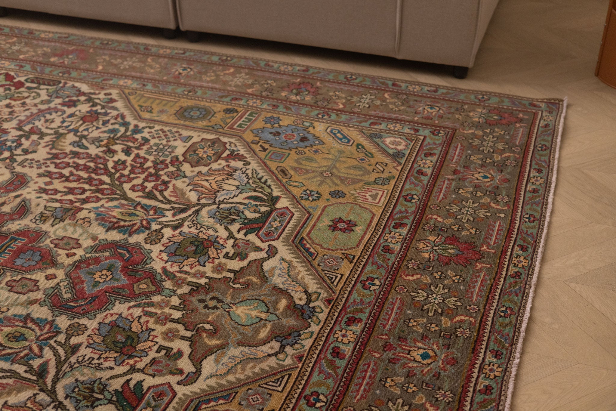 Persian style oversized area rug with elegant floral motifs and rich colors. Luxurious design that anchors your space beautifully. Timeless craftsmanship meets sophisticated style for any room.