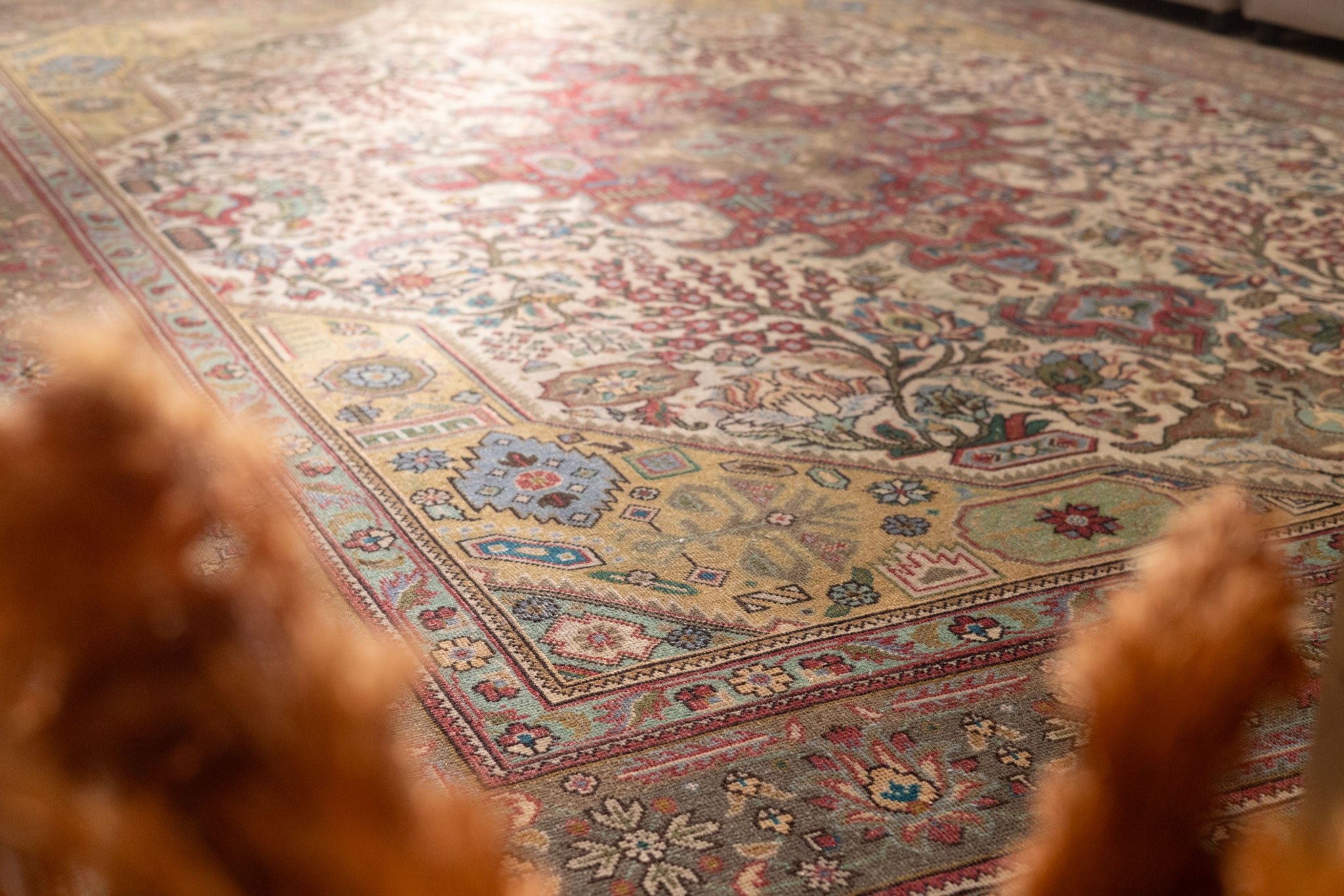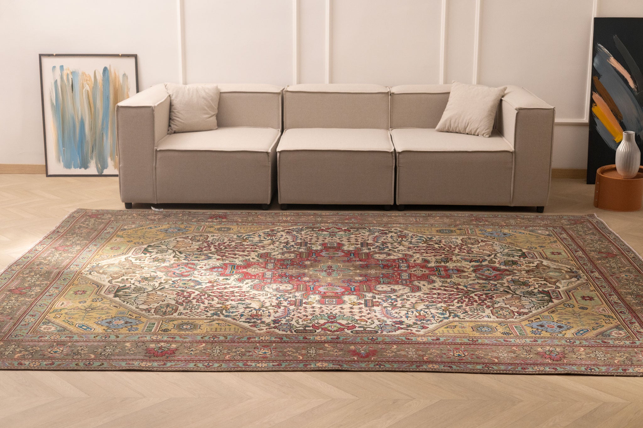 We recommend vacuuming your vintage rug once or twice a month to remove dust and dirt. Use a suction-only vacuum or an attachment without a rotary brush, as this protects the wool fibers and hand-knotted foundation from unnecessary wear.