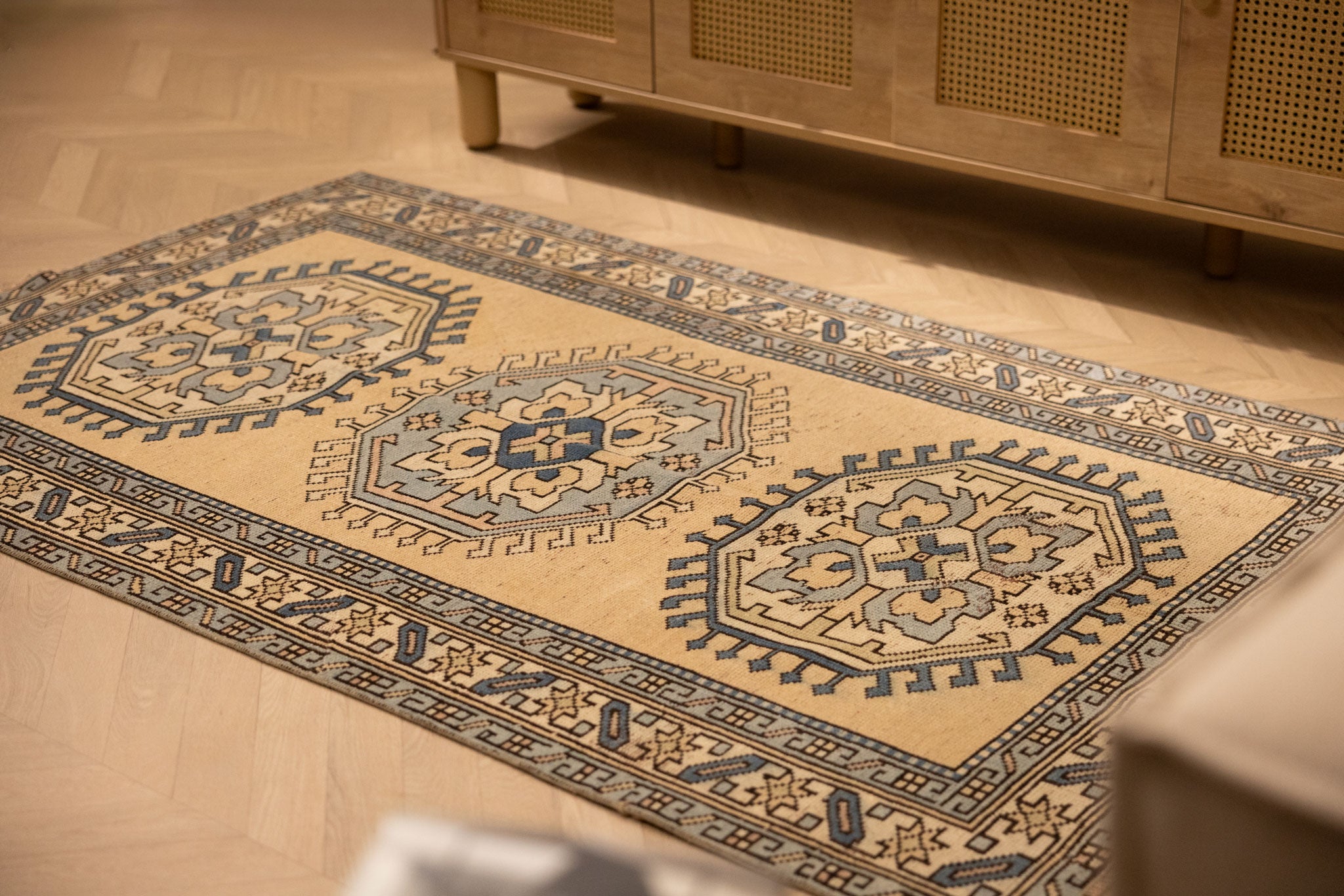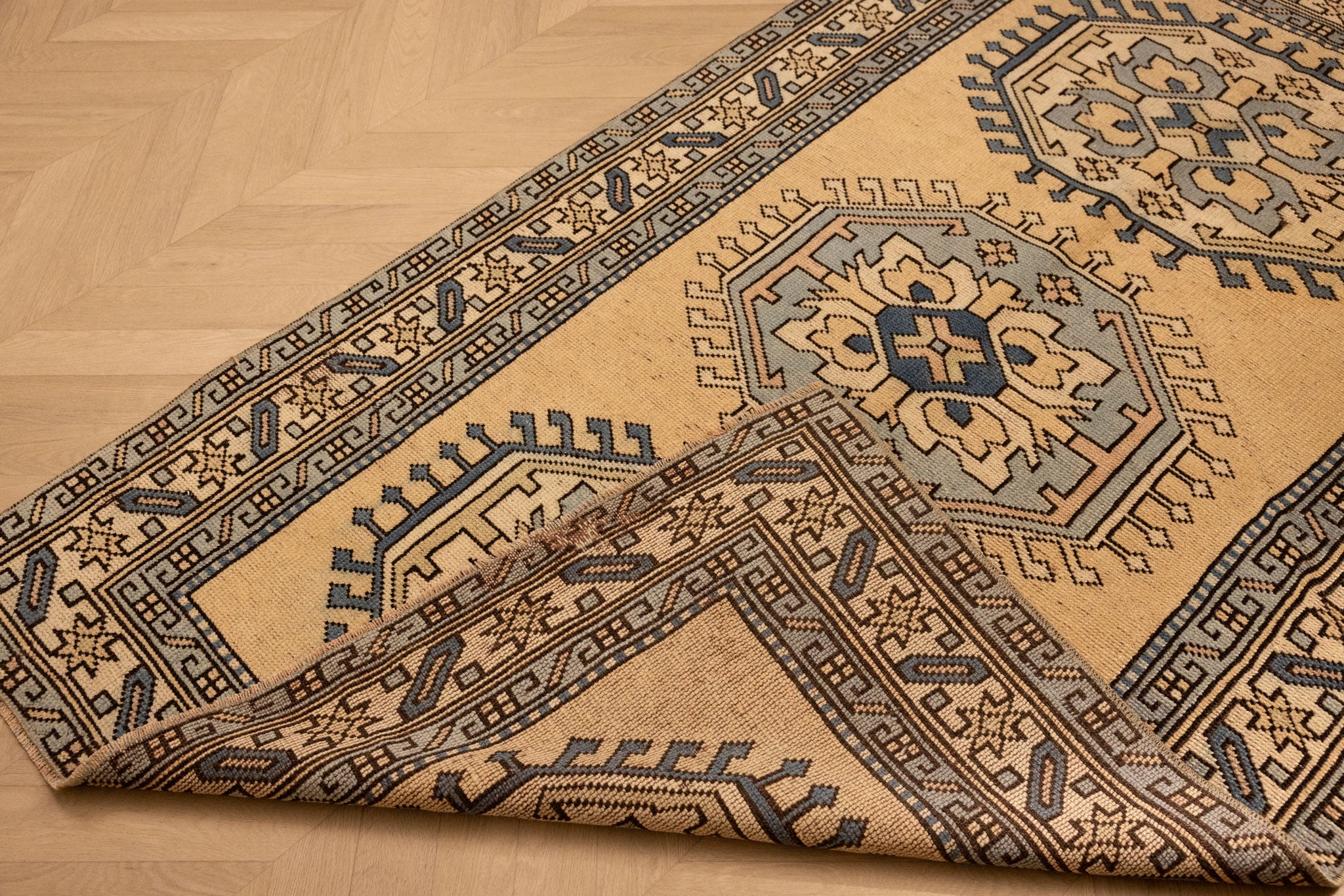 Every 3–5 years, we suggest a professional hand-wash for vintage Turkish rugs. Please avoid steam cleaning or dry cleaning, as these methods can damage natural wool fibers and vegetable dyes. A safe cleaning method involves pH-balanced soap and a soft-bristled brush, followed by gentle rinsing.