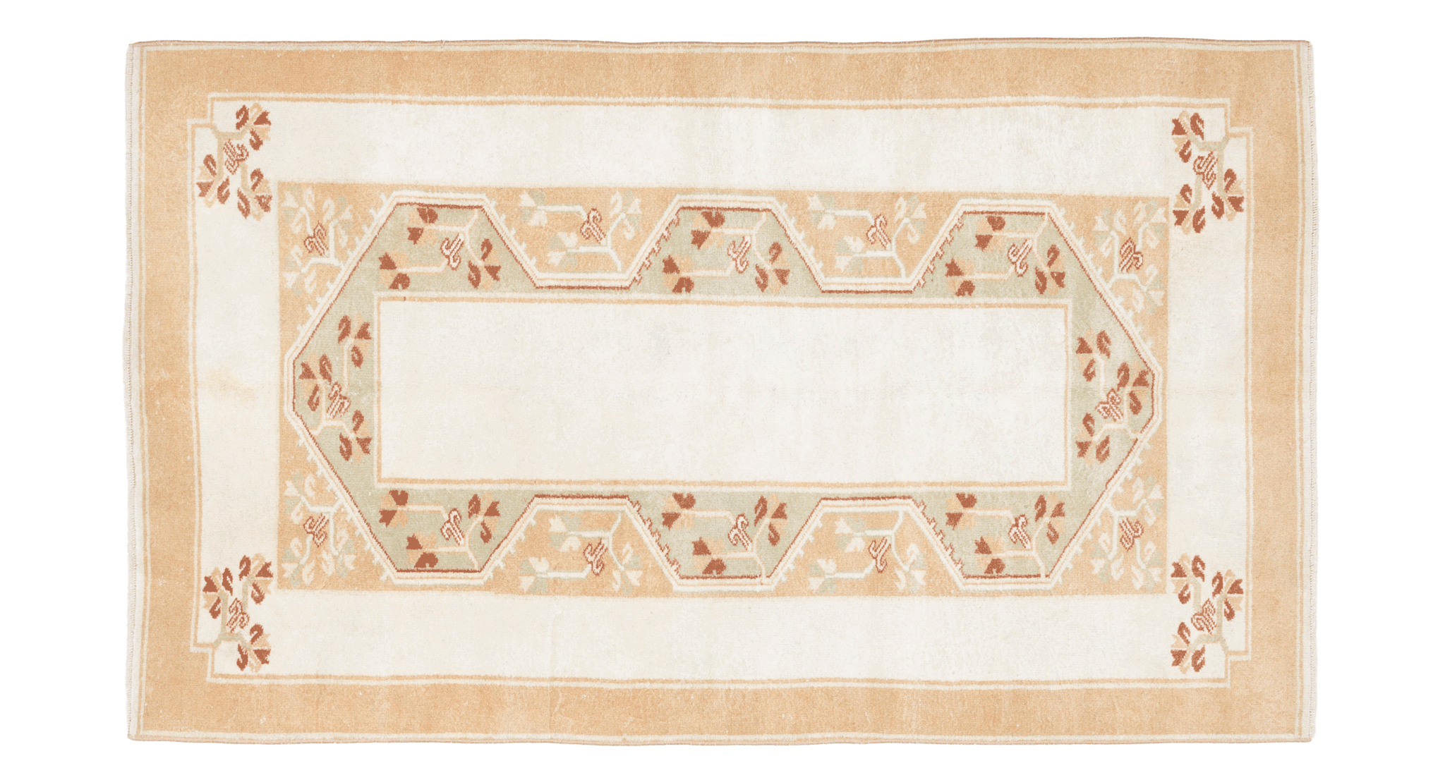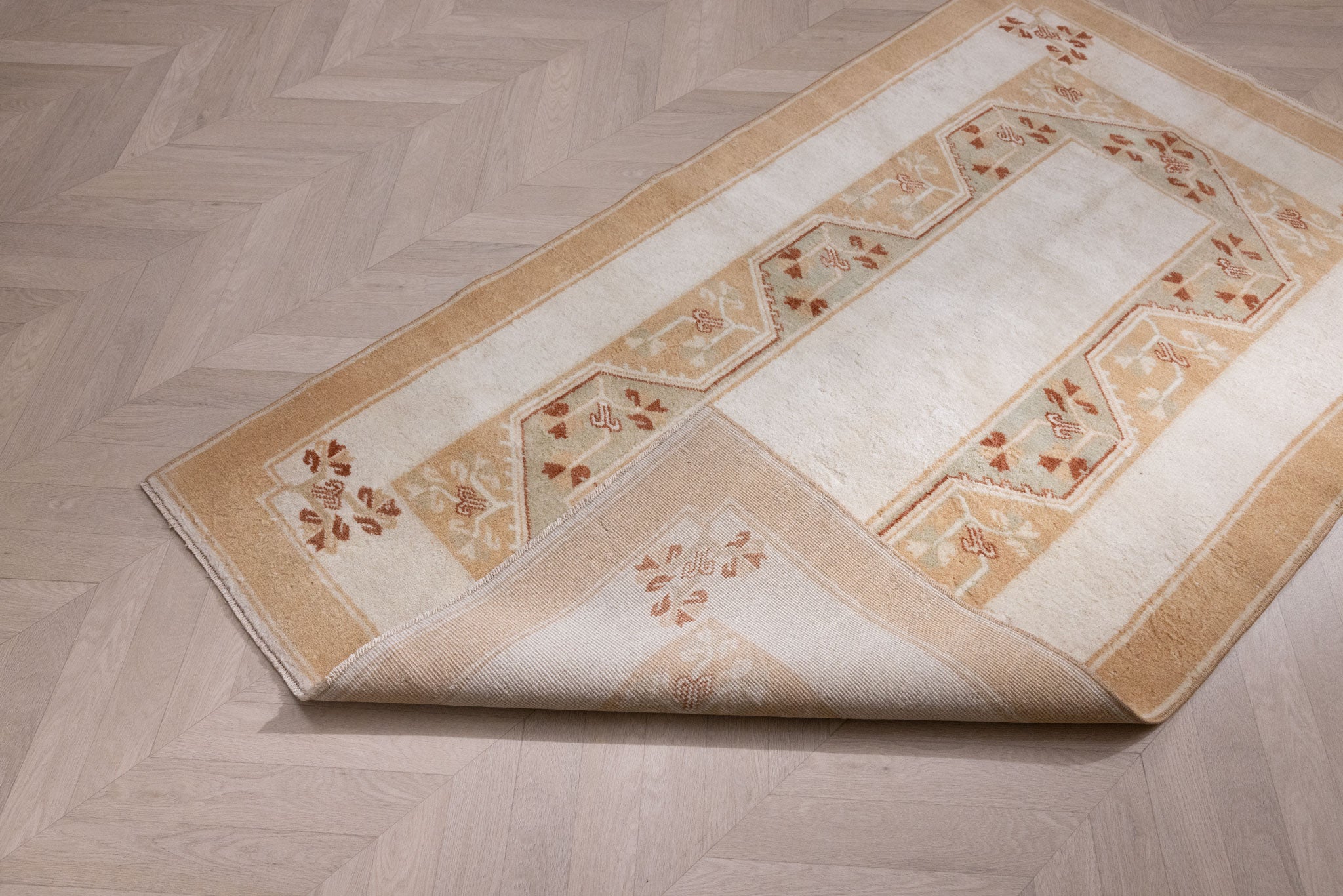 Every 3–5 years, we suggest a professional hand-wash for vintage Turkish rugs. Please avoid steam cleaning or dry cleaning, as these methods can damage natural wool fibers and vegetable dyes. A safe cleaning method involves pH-balanced soap and a soft-bristled brush, followed by gentle rinsing.