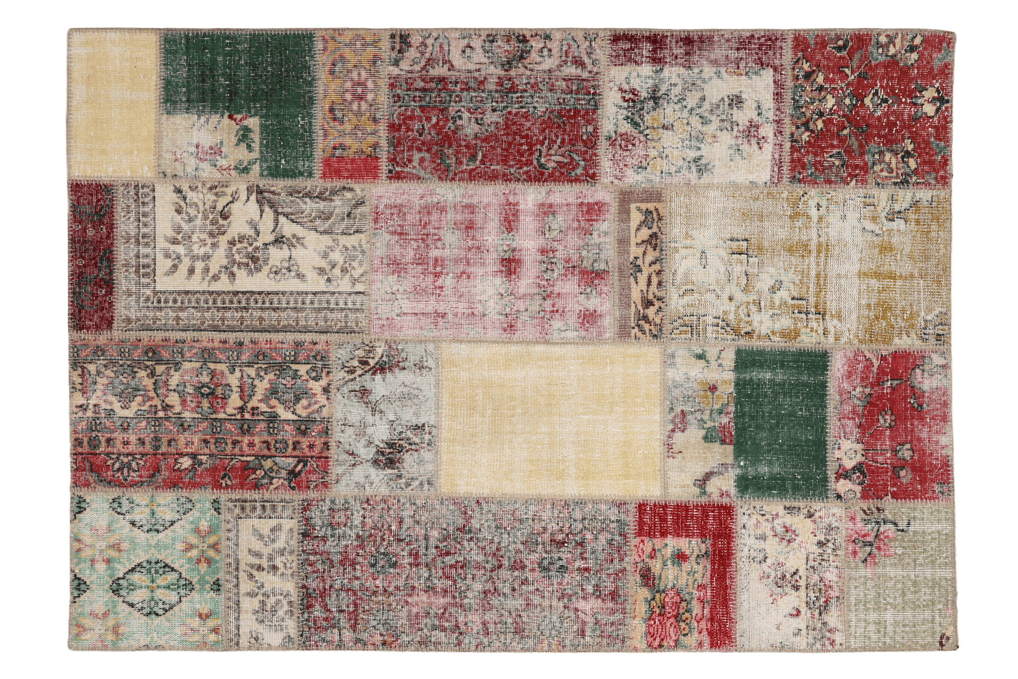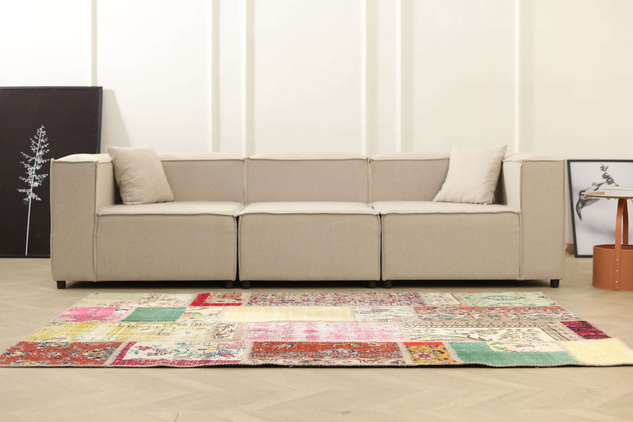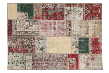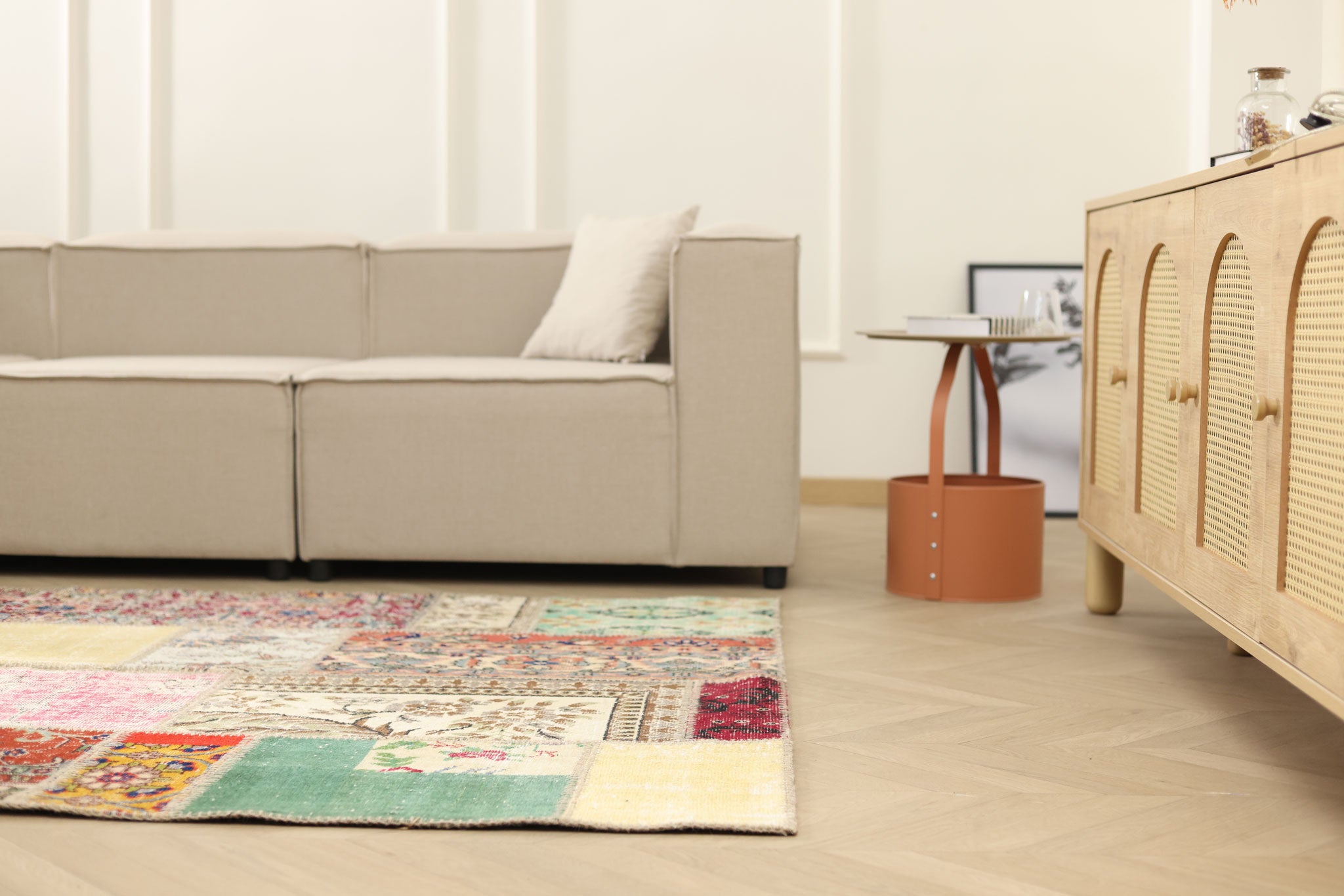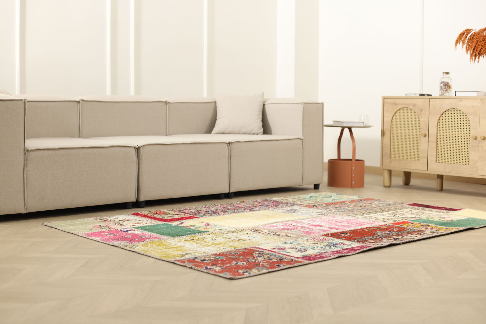 Patchwork area rug with vibrant, mixed patterns and colors. Unique vintage-inspired design made from hand-stitched pieces. Adds eclectic charm and personality to any modern or bohemian space.